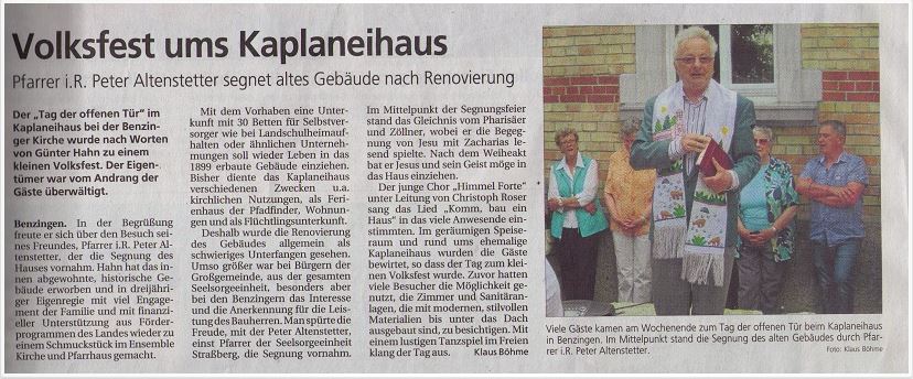 Das Team vom Kaplaneihaus Benzingen bedankt sich ganz herzlich bei den zahlreichen Besuchern und bei allen Helfern, die zum Gelingen dieses grandiosen Auftakts beigetragen haben. Ebenso möchten wir uns bei Pfarrer i. R. Peter Altenstetter bedanken, der alle Anwesenden mit seiner Segnungsfeier begeisterte.